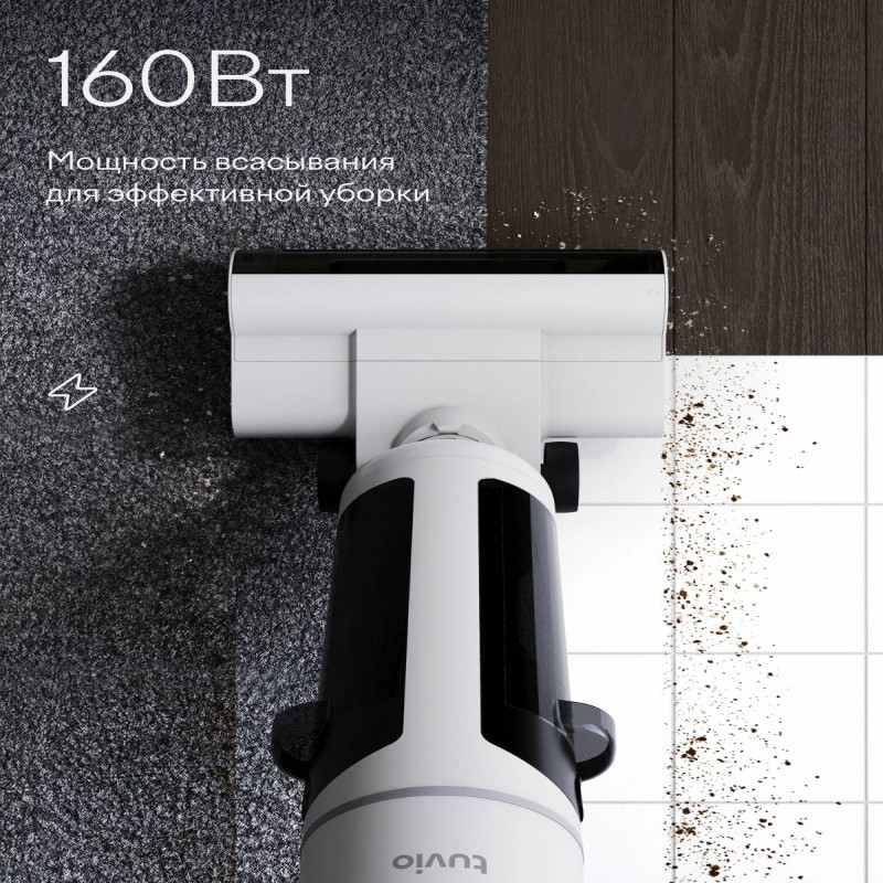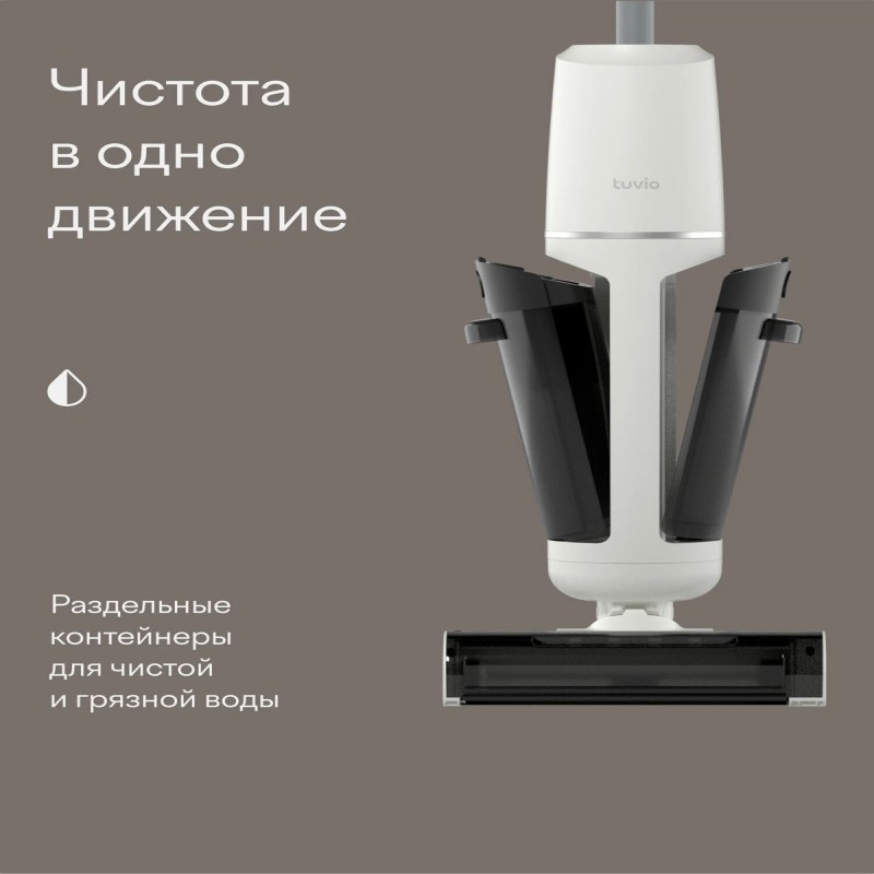 Tuvio TVC01W — это беспроводной вертикальный моющий пылесос со станцией самоочистки. Эффективный и мощный, с двумя контейнерами для чистой (0,58 л) и грязной (0,52 л) воды.