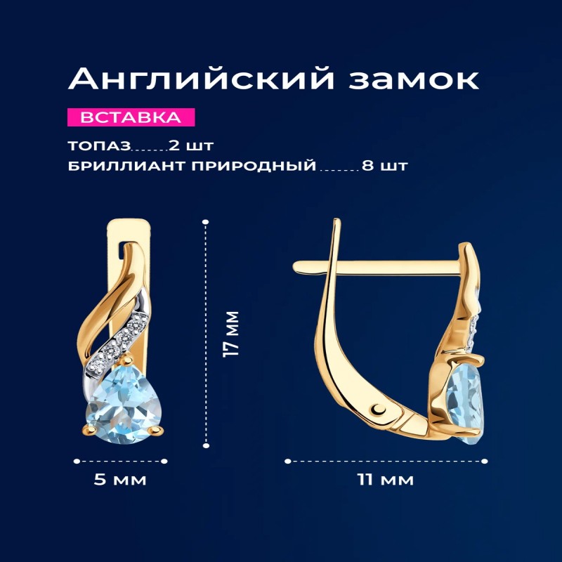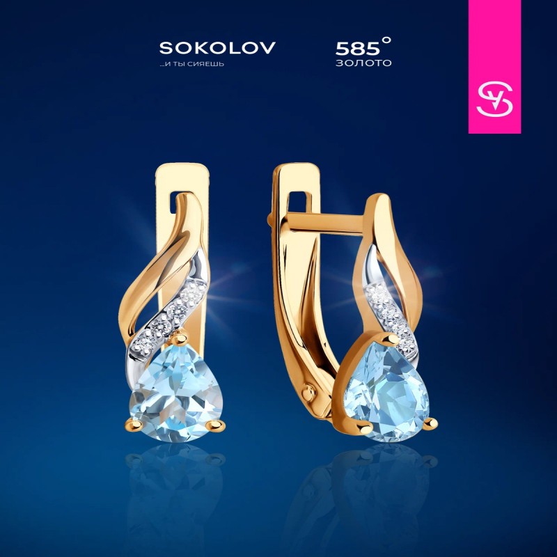 Серьги золотые женские 585 пробы SOKOLOV, ювелирные украшения с бриллиантами и топазами это изделие, которое подчеркнет вашу индивидуальность и придаст вам особый шарм. Бренд SOKOLOV гарантирует высокое качество и безупречный дизайн каждой пары серег. Сережки женские золотые - это очень элегантные украшения, которые прекрасно подходят для вечерних выходов или повседневных образов. Их стильный дизайн и блеск камня привлекают внимание окружающих и добавляют особую изысканность вашему образу. Золотые серьги 585 женские обладают особой прочностью и стойкостью. Цвет золота придает серьгам особую теплоту и роскошь. Благодаря своей универсальности, необычные серьги подходят для любого возраста и стиля. Дизайнерские сережки отлично смотрятся как на молодых девушках, подростках, так и на женщинах более зрелого возраста. Удобный замок на золотых серьгах Соколов обеспечивает надежное крепление сережек на месте даже при активном движении. Вы можете быть уверены, что ваше украшение останется на месте, даже при ежедневном ношении. Ювелирные изделия из золота давно завоевали популярность у женщин и девушек. Это не только стильный аксессуар, но и символ роскоши и успеха. Минималистичные украшения из красного золота 585 пробы бренда SOKOLOV, вы подчеркнете свою индивидуальность и элегантность. Женские серьги из красного золота 585 пробы отличный выбор для всех девушек и женщин. Они будут стильным дополнением к вашему гардеробу и подчеркнут ваш неповторимый стиль. Украшения комплектуются с подарочной упаковкой, идеально подходят для подарка любимой женщине и девушке, девочке на день рождения, 8 марта, день всех влюбленных или любой другой повод. Вес товара, указанного в карточке, является средним и может отличаться от фактического. Значение веса на фото и в характеристиках являются примерными и могут отличаться от фактического. Чтобы украшение радовало Вас своей красотой бесконечно долго, рекомендуем избегать попадания на него агрессивных химических средств. Гарантийный срок для ювелирных изделий составляет 6 календарных месяцев, и исчисляется со дня передачи изделия потребителю.